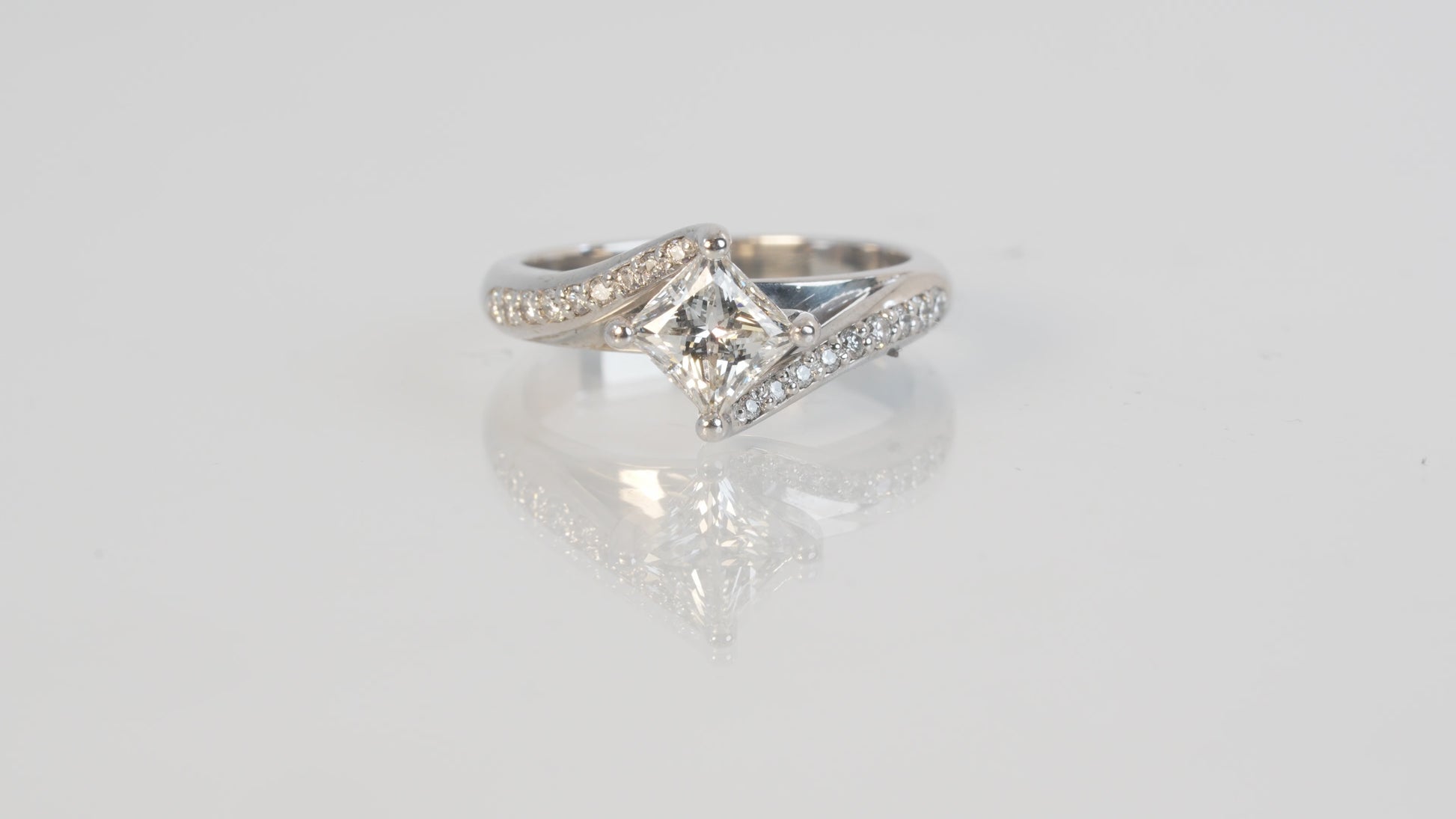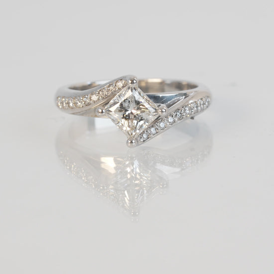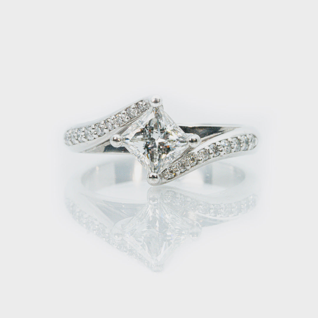 This engagement ring is perfect for those seeking a distinctive and modern design that still captures the classic elegance of a princess-cut diamond. Embrace the enduring beauty and individuality of our 18-carat White Gold Off-Set Princess Cut Diamond Engagement Ring.